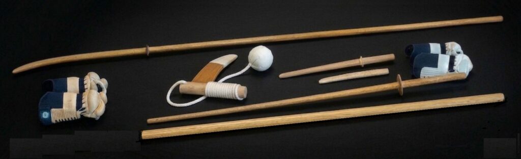 Naginata (Long pole-sword) Tachi (Long sword) Kodachi (Short sword) Jo (Short staff) Kusarigama (Chain-sickle) Tanto (Dagger)